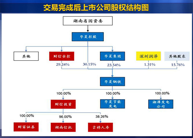 本次重组完成后,华菱集团、财信金控系华菱控股之控股子公司,三者为一致行动人,重组完成后合计持有上市公司82.93%股份。上市公司实际控制人仍然为湖南省国资委。