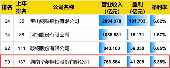 湖南华菱钢铁股份有限公司以766.564亿元营业收入列榜单第99名,进入2018年中国500强前100名,较2017年前进38个位次,同时,在上榜的22家钢铁冶金企业排位中由去年的第7位上升至第4位。并继续蝉联中国500强湖南企业第一名。