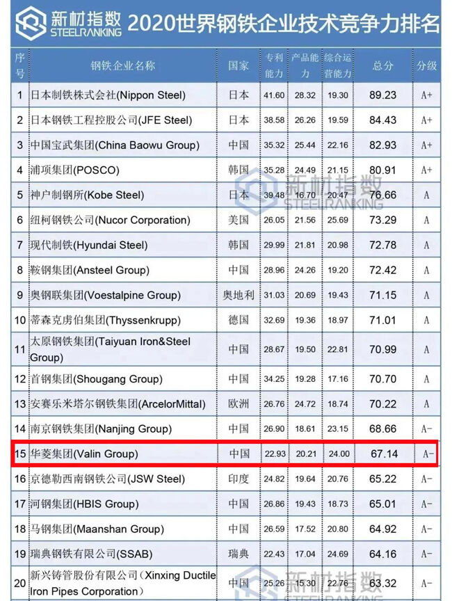 8月3日,新材指数(SteelRanking)正式发布2020世界钢铁企业技术竞争力分级评价排名。全球共有50家钢铁企业入围,其中31家中国企业,19家外国企业,华菱集团以总分67.14位列第15名。
